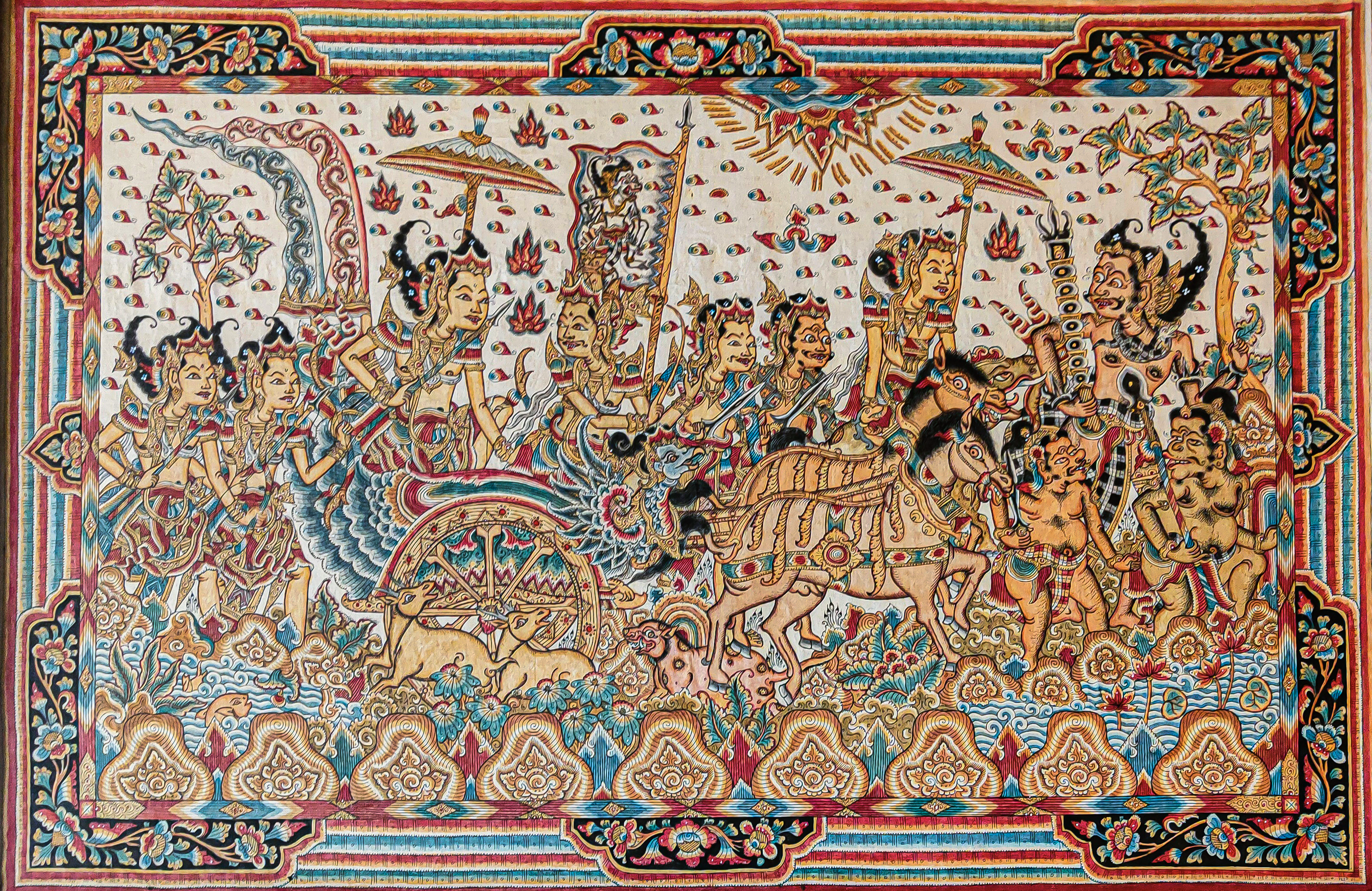 BHARATAYUDDHA Lukisan tersebut menceritakan kisah konflik para Pandawa lima dengan saudara sepupu mereka sang seratus Korawa, mengenai sengketa hak pemerintahan tanah negara Astina. Puncaknya adalah perang Bharatayuddha di medan Kurusetra dan pertempuran berlangsung selama delapan belas hari.