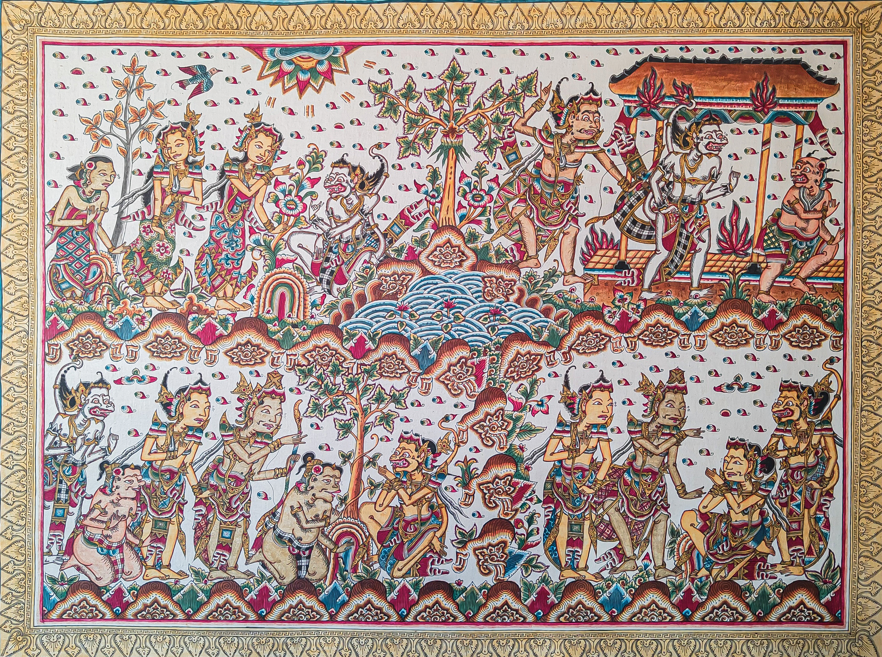 RAMAYANA Pada karya lukisan wayang Kamasan ini menggambarkan beberapa kisah dalam cerita Ramayana saat Rama dan pasukannya menuju ke kerajaan alengka.